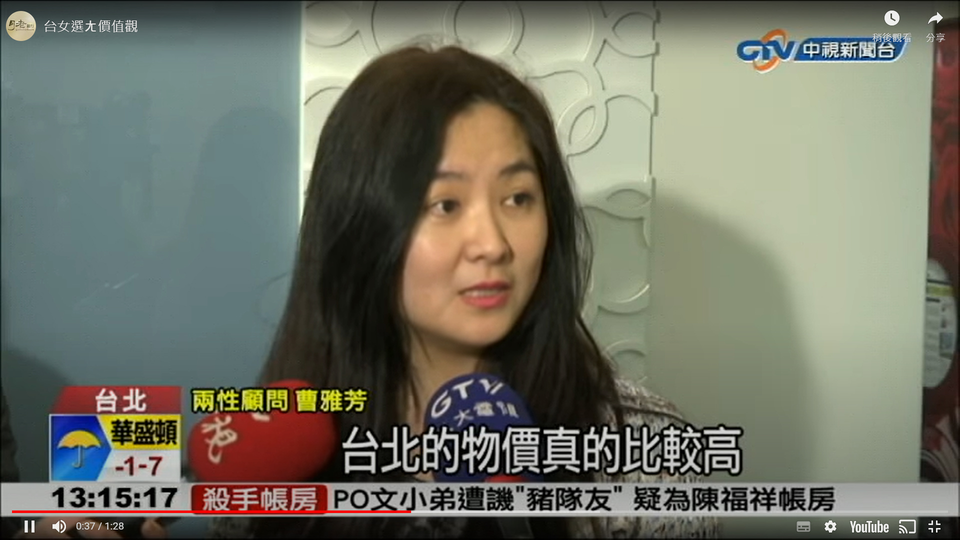 中視新聞_2015.01.26 月老銀行公關經理曹雅芳表示,女生可能考慮到台北的物價比較高,對方將來的薪資能夠維持家庭生活,建議雙方應以是否有共同興趣為主要考量 ...