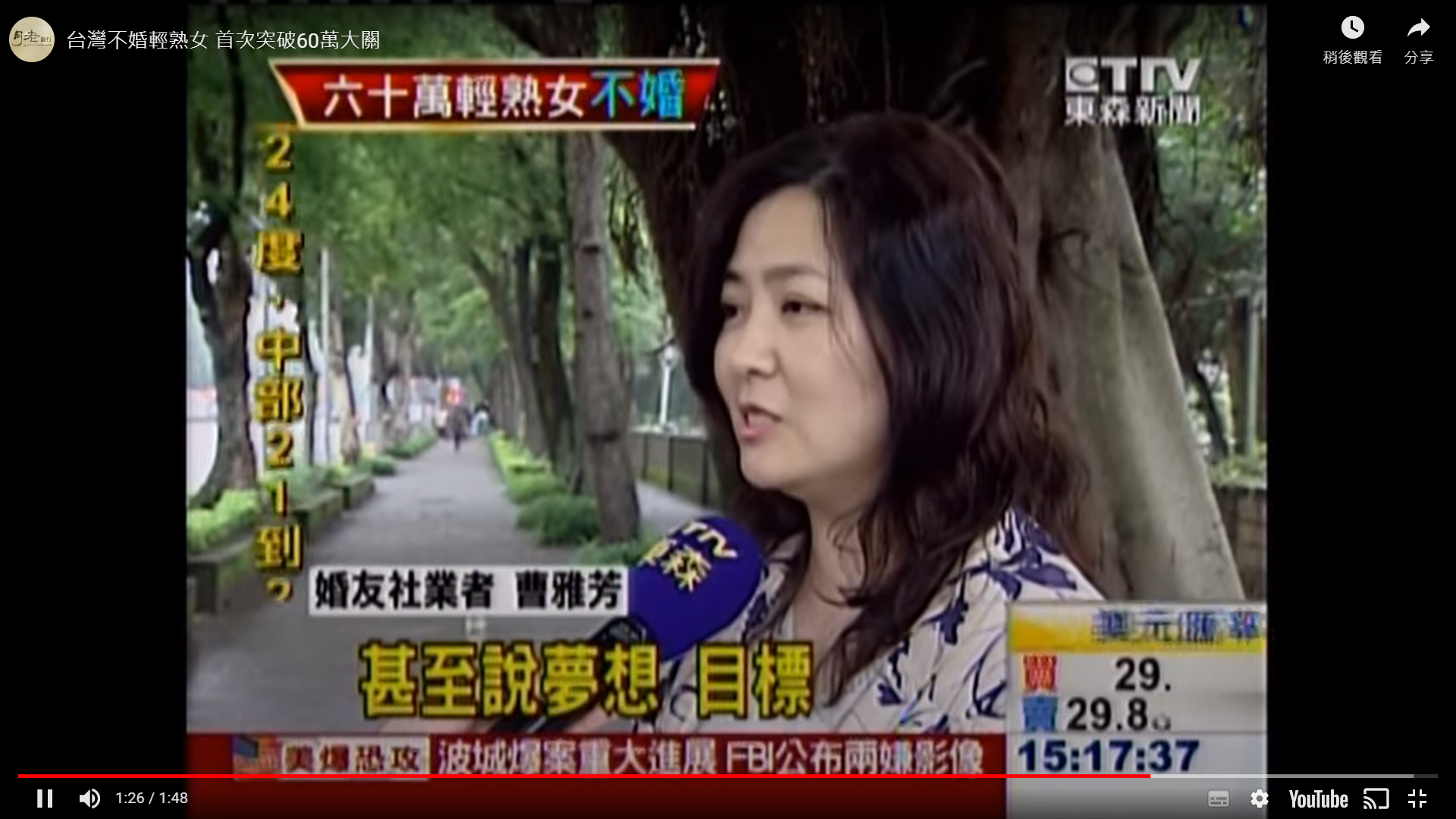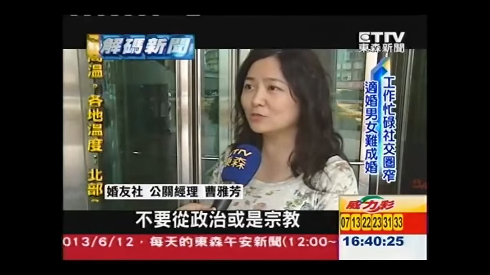 東森新聞_2013.04.19 台灣未婚輕熟女人數攀高,月老銀行公關經理曹雅芳表示:在學歷、經歷已有不亞於男性的趨勢下,對於未婚女性應表示尊重,不應再稱呼女性[ 敗犬] ...