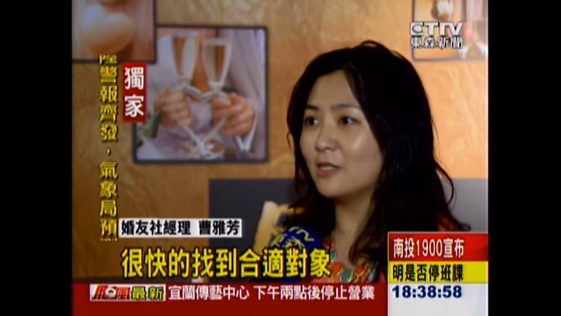 東森新聞_2013.03.21 目前台灣近600萬單身男女,因工作忙碌、生活壓力大等各種因素影響,月老銀行公關經理曹雅芳表示,為了讓更多單身男女能迅速找到另一半,特別推出全台首創『免費相親』服務...